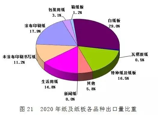 2020年紙及紙板出口587萬噸,較上年增長-14.43%;紙漿出口10.55萬噸,較上年增長-9.05%;廢紙出口0.12萬噸,較上年增長50.00%;紙制品出口324萬噸,較上年增長-6.09%。